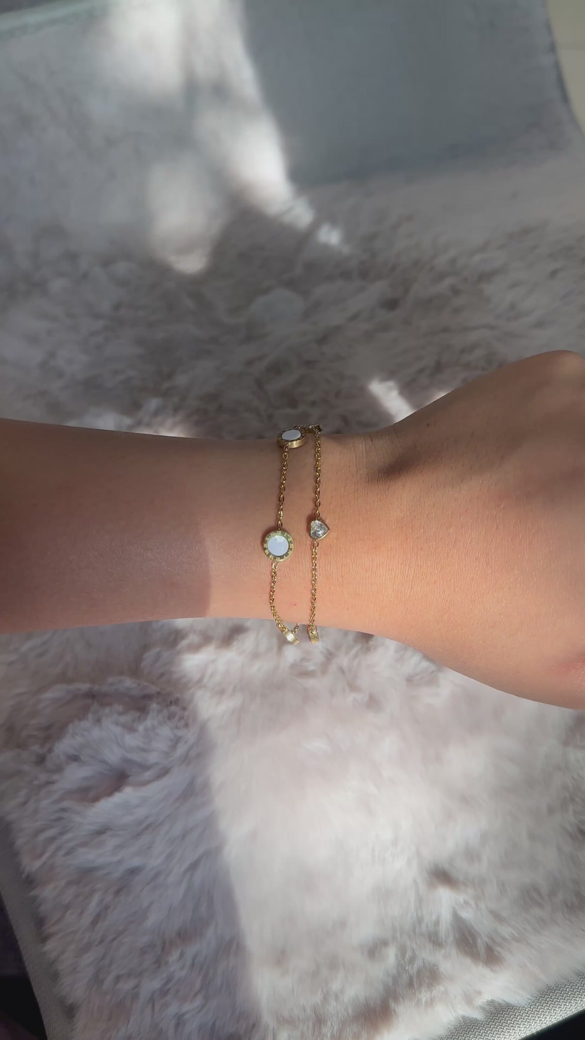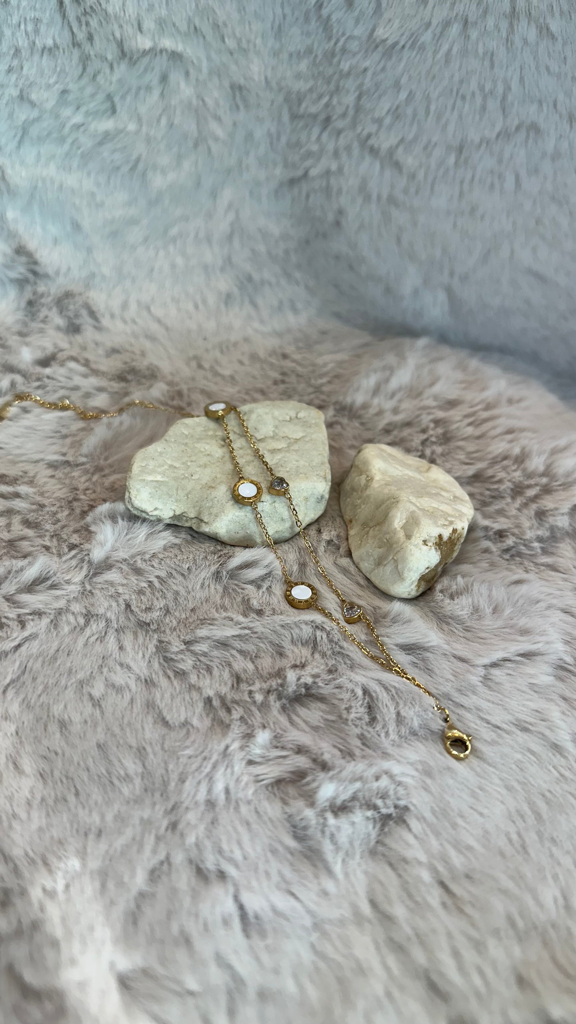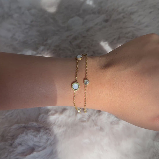 A delicate blend of elegance and glow, Celessa is your go-to piece for a hint of celestial charm. With mother-of-pearl-like discs and heart-shaped crystals resting on a sleek gold chain, this bracelet captures the softness of moonlight in a timeless form.