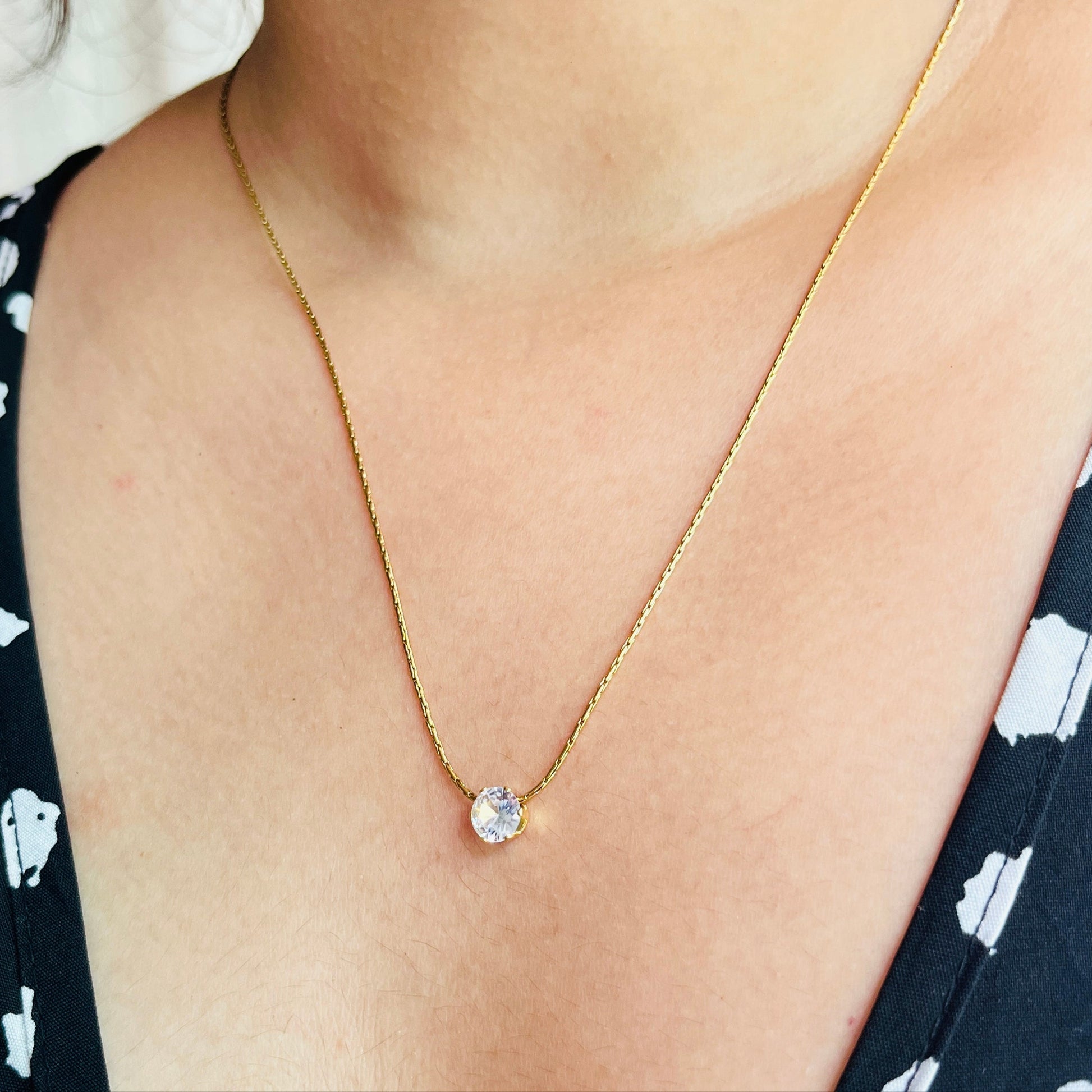 A timeless ode to clarity and grace, the Clairé Necklace features a single, brilliant-cut stone that radiates elegance from every angle. Suspended on a delicate gold-toned chain, this piece brings effortless charm to your everyday look — simple, stunning, and endlessly versatile.