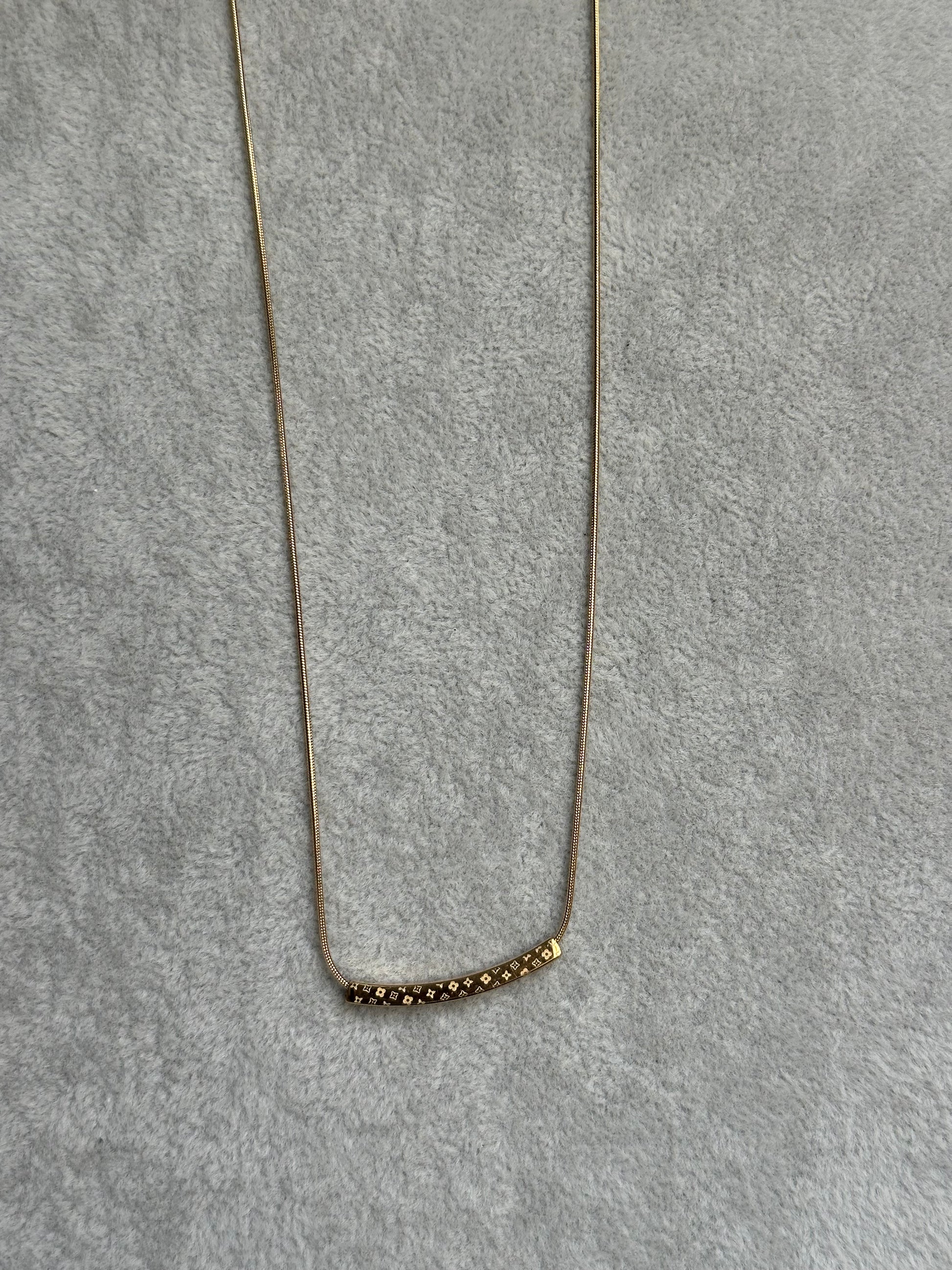 A minimalist gold pendant suspends effortlessly from a fine chain, creating a refined statement that complements any outfit—day or night.