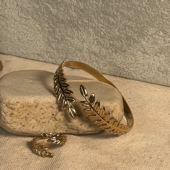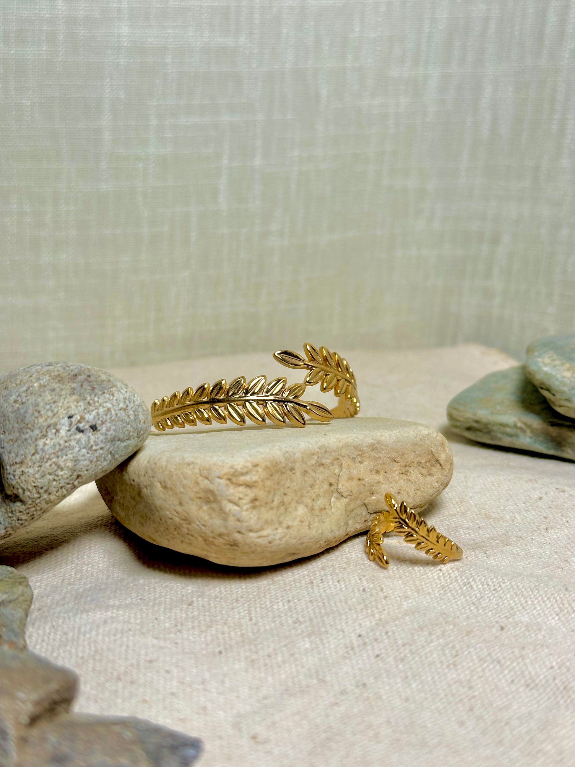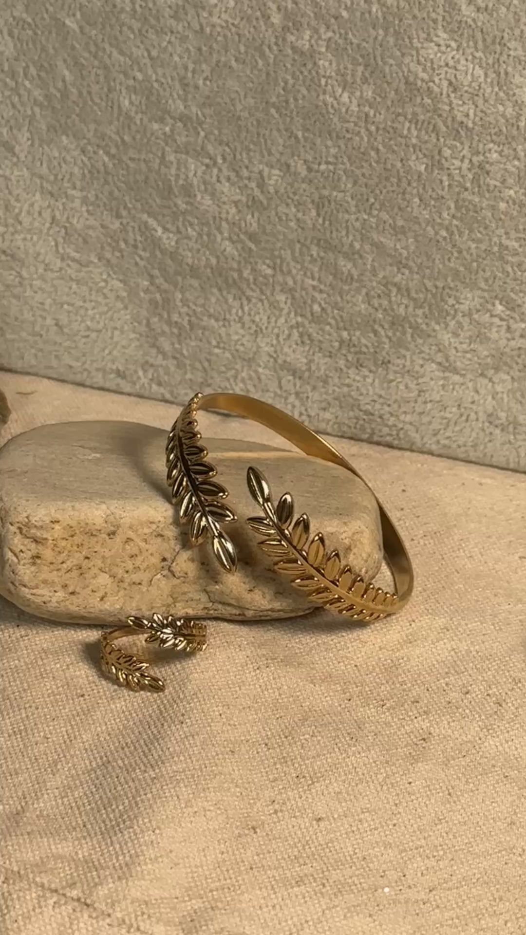 Crafted with a matching leaf pattern, this duo features a sleek bangle bracelet and a complementing ring — both adorned with soft, golden leaf motifs that whisper of earthy beauty and gentle strength. Whether worn together or styled separately, Leafora adds a graceful glow to every gesture.