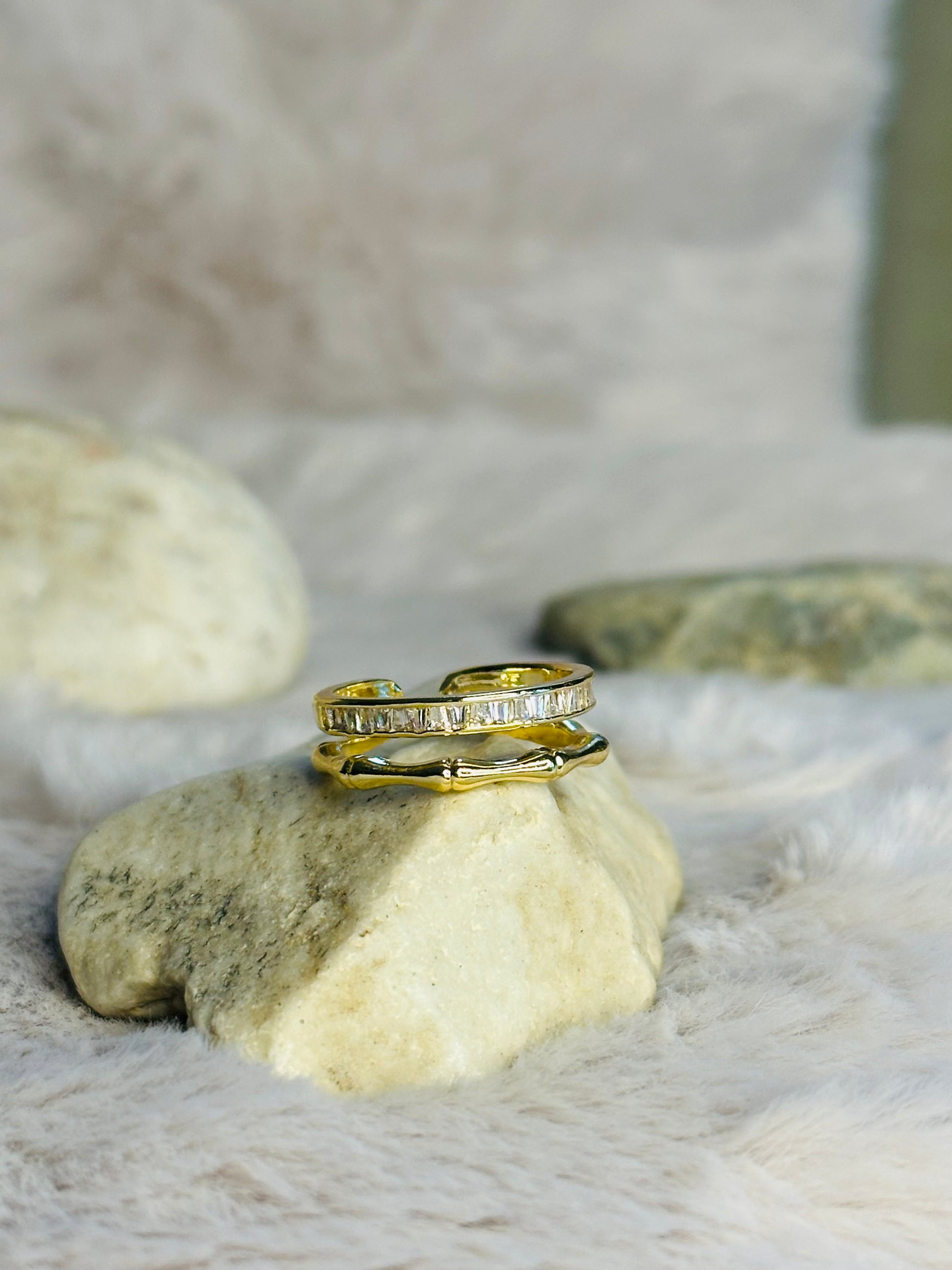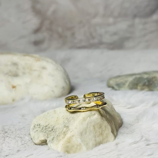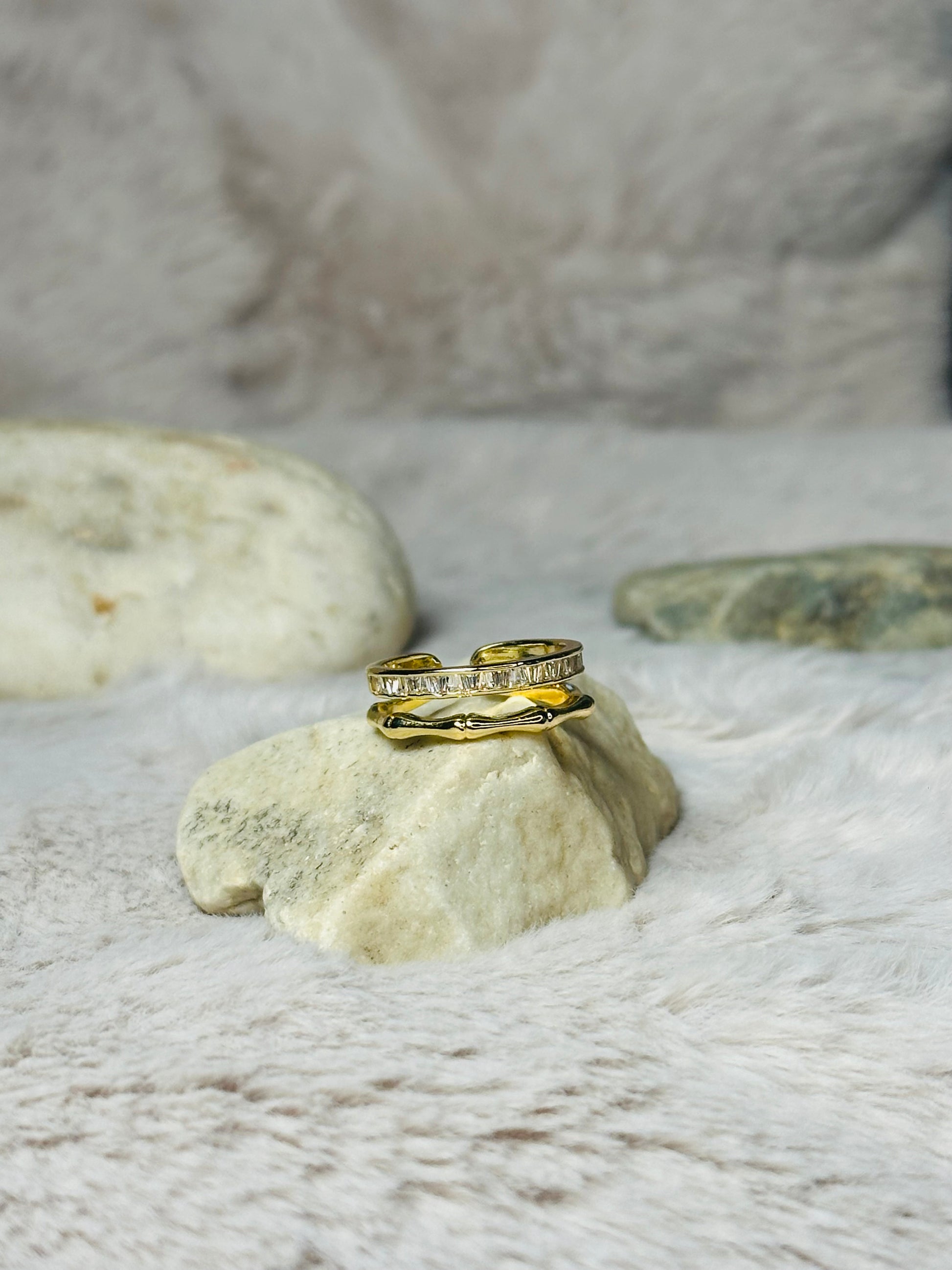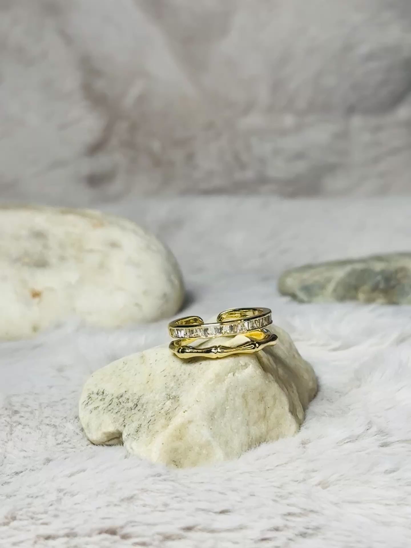 A duo designed to inspire. The Muse Ring set pairs a sleek baguette stone band with a subtly textured, organic curve band — a harmony of brilliance and form. Wear them together for a statement look or solo for everyday elegance.